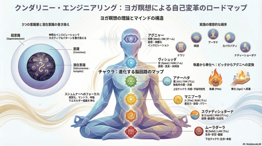Gregor先生のクラスを通じて学んだのは、瞑想とは単なる「リラクゼーション」や「マインドフルネス」ではなく、「クンダリーニ・エンジニアリング(エネルギーの工学)」であるという視点です。パタンジャリの定義によれば、ヨガとは「サマーディ(三昧)」そのものであり、心をレーザーのように一点に集中させ、対象と自己を一致させるプロセスに他なりません。