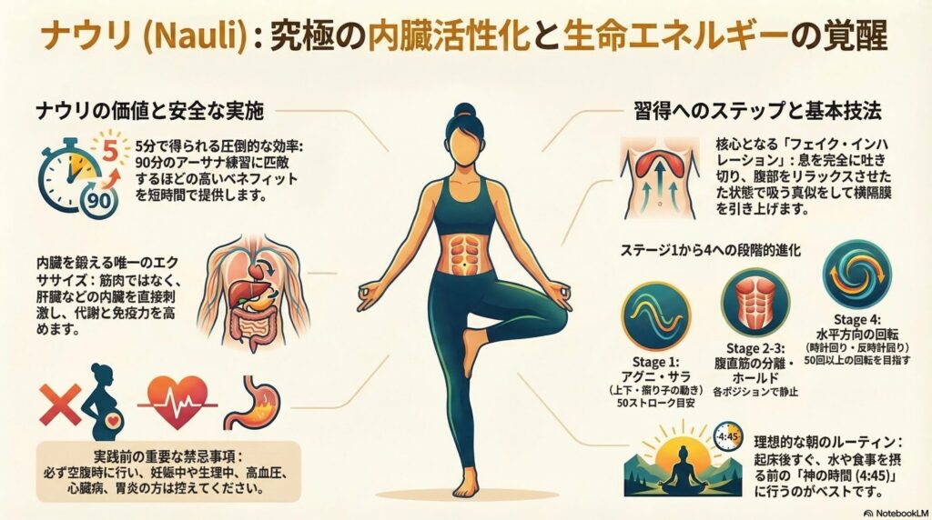 ヨガの練習において、アーサナに90分かけることもありますが、ナウリはわずか5分間の実践で極めて大きなベネフィットを得られる、時間対効果の非常に高いテクニックです。Gregor先生が説くナウリの真髄は、単なる腹筋運動ではなく、内臓をマッサージし、潜在的なエネルギーを上昇させる「内なる工学」にあります。